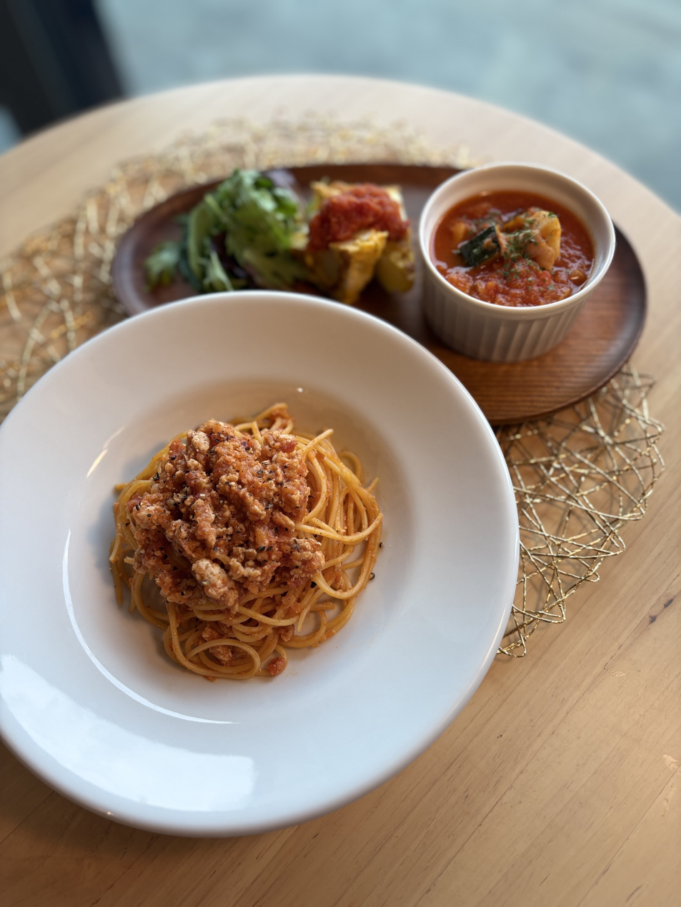 ミートソースは鶏むねひき肉を使うことで合いびき肉よりタンパク質が摂れるパスタになります!